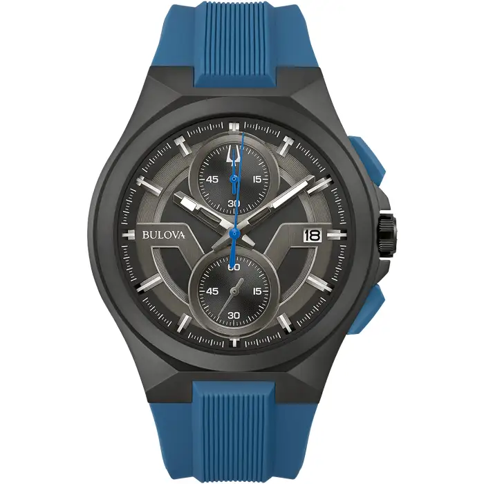 Modern styling for the wrist, the Maquina has a comfortable blue silicone strap and black IP stainless steel case. The black dial features blue accents and date display at the 3 o'clock position. Additional features include 1/20 chronograph measuring up to 60 minutes, 100 metre water resistance and sapphire crystal.