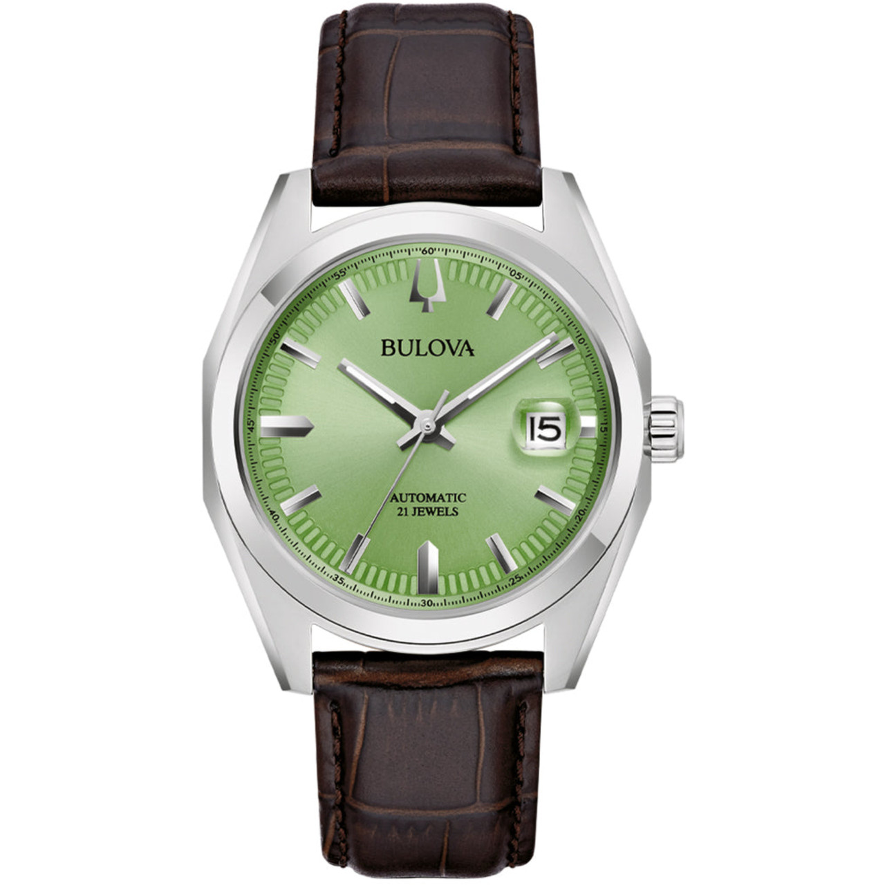 The Bulova men’s Surveyor is defined by exceptional quality and sophisticated aesthetics. The silver-tone stainless steel case features sculpted edges and faceting which provide an effortless wear on the wrist, with polished and brushed finishing, a flat sapphire crystal, and a quick-release brown leather strap. The striking pistachio radiant dial has a sunburst finish and features silver-tone accents, hands with luminescent fill, debossed minute markers, and a magnified date display. The watch is powered by an 21-jewels and a 42-hour power reserve, which can be seen in full through a mineral crystal exhibition window in the caseback. For those with a discerning eye for refined luxury, this Bulova men’s timepiece is the obvious choice