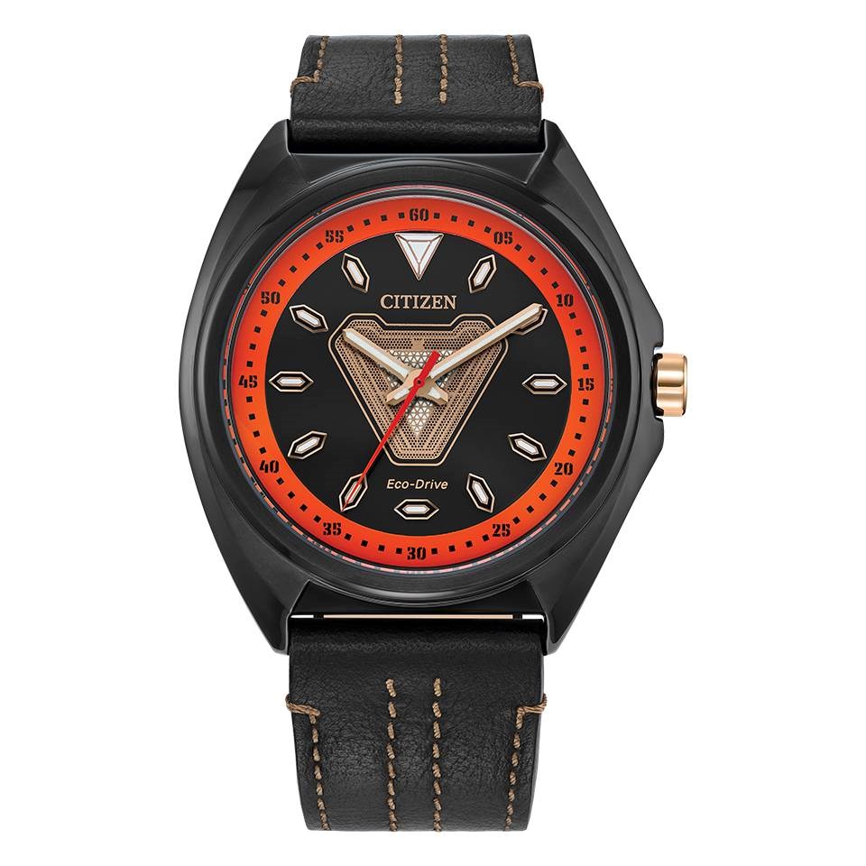 Featuring the iconic shapes of the Arc Reactor on its dial, this action-ready watch reflects the Super Hero's ingenuity and the technological edge of Stark Industries on the wrist. With up to 100 metres of water resistance, this hardwearing timepiece is as robust in functionality as its design indicates. A geometric, black IP case and a matching black leather strap with contrast stitching secure the timepiece, while on the dial, gold-tone and fiery red details further channel Tony Stark's signature aesthetic and suit of Iron Man armour. Powered by any light with our Eco-Drive technology.