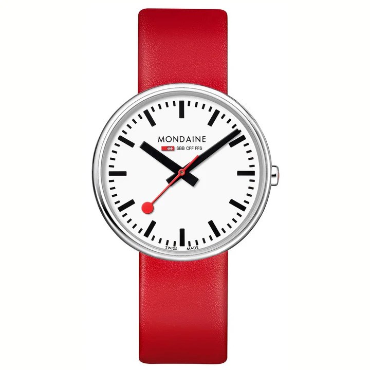 Big ideas need lots of space. The Mondaine Giant watch is a real eye-catcher. The prominent red second hand is its iconic feature and with this watch's impressive size you make a true statement. With the Giant collection, Mondaine demonstrates the innovative strength behind its traditional brand. The magnifying mineral glass supports the distinguishing look of this design and ensures optimal readability. The leather strap is embedded in the steel case lending the watch a very unique look and providing maximum comfort. The red crown adds the perfect finishing detail.