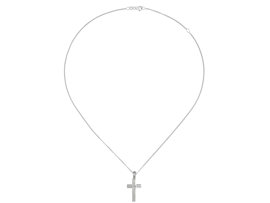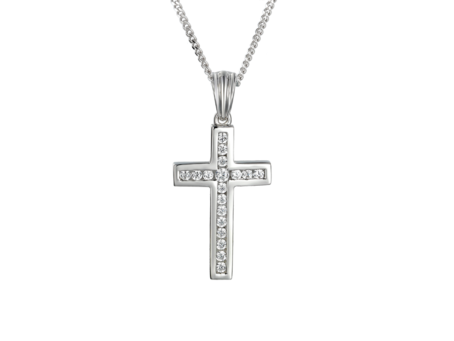This cross is 25mm high including the loop and 12mm wide with 18 round Cubic Zirconia set in channels.