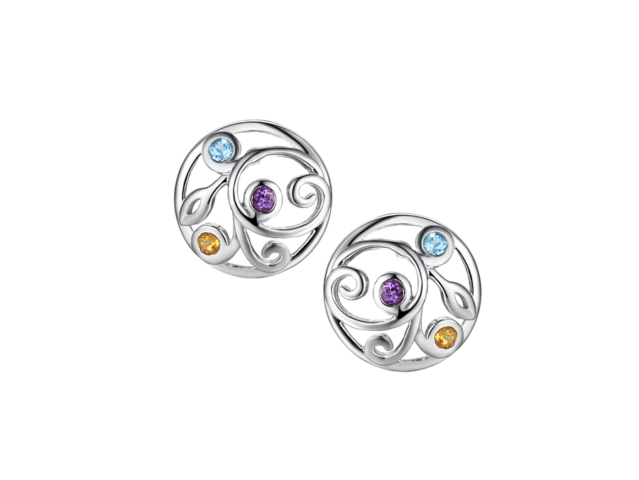 Filigree design combining beautiful semi-precious blue topaz, amethyst, peridot and citrine creating a vibrant mix of colours. The unique characteristics of these gemstones combine to create an engaging stud earring with a medley of colours that will certainly bring a smile to your face and liven up your day.